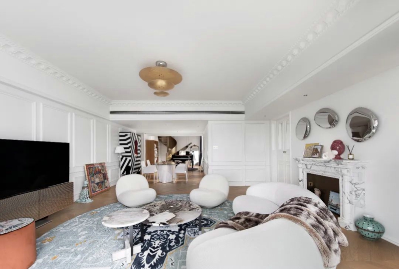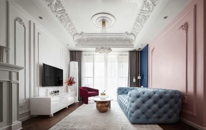 因此法式風繼承了這種高層高,垂拔向上的空間感,與此同時,墻面和頂面都有豐富紋理的雕花線條來營造法式獨特的韻味,豐富墻、頂面的界面設計。