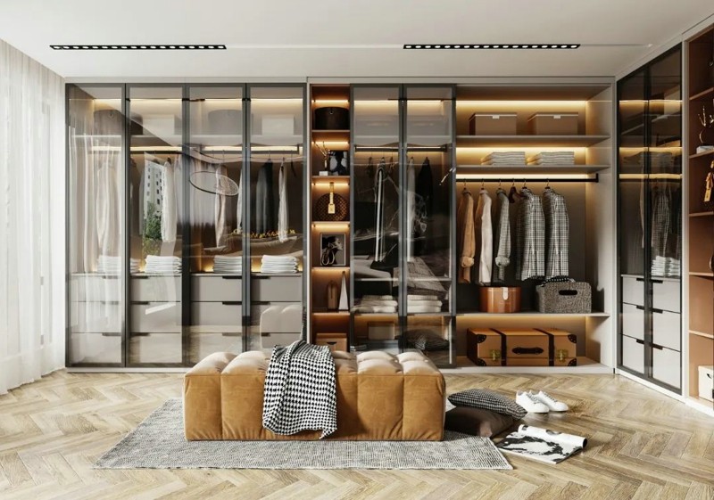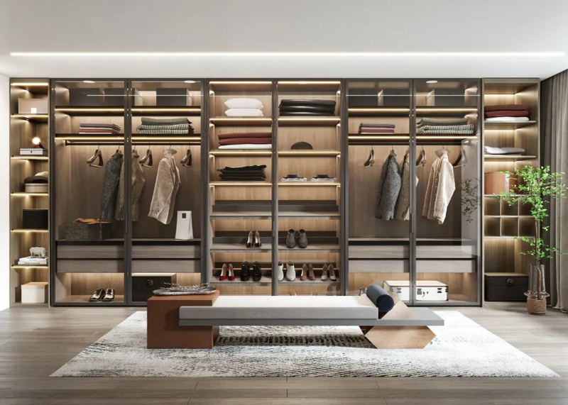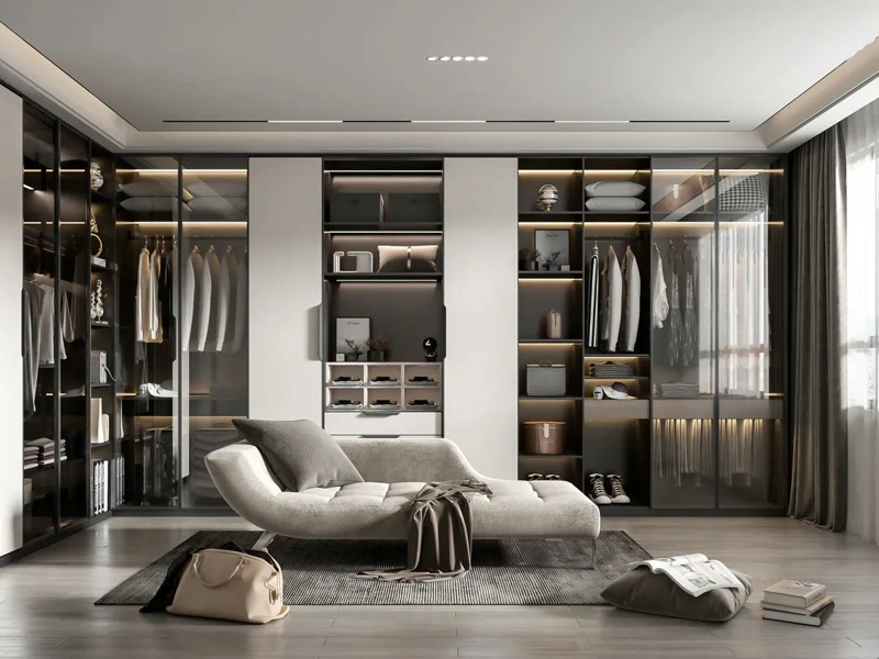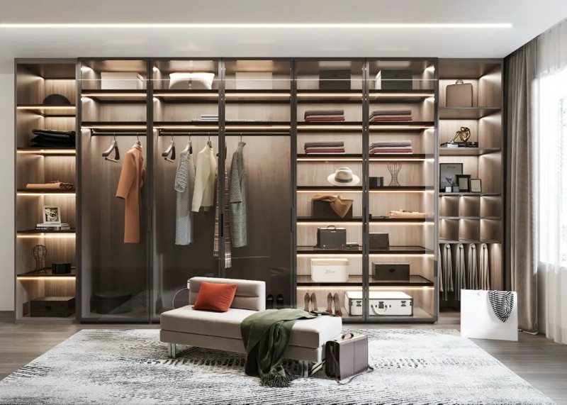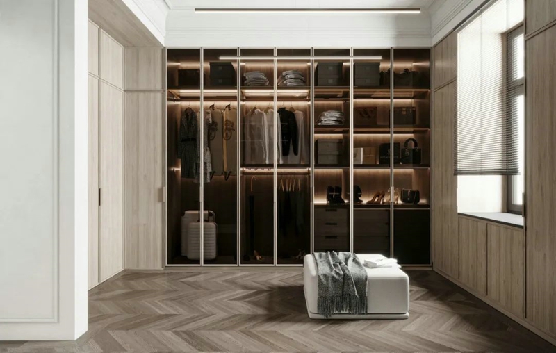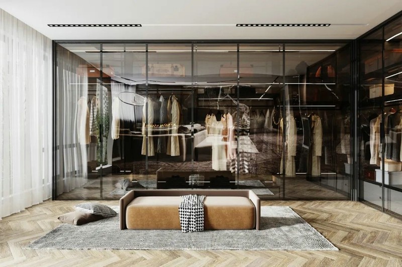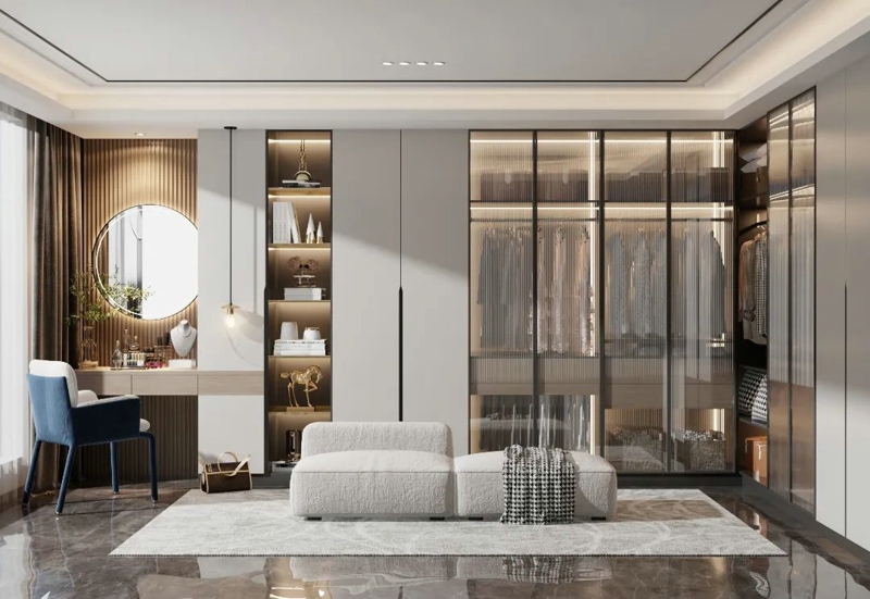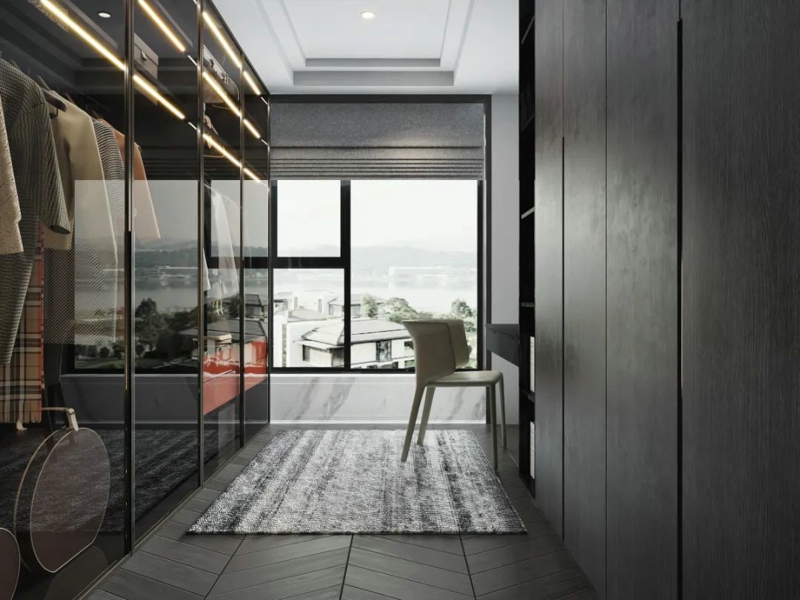 通頂的玻璃衣柜,一氣呵成,拉伸了空間的縱深感,在線性燈光的加持下,摩登質感悄然迸發。